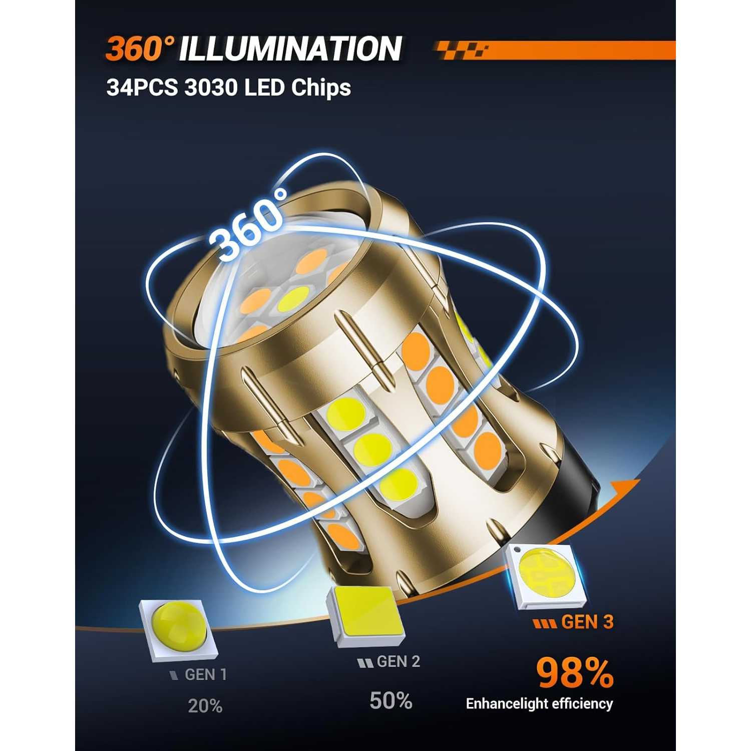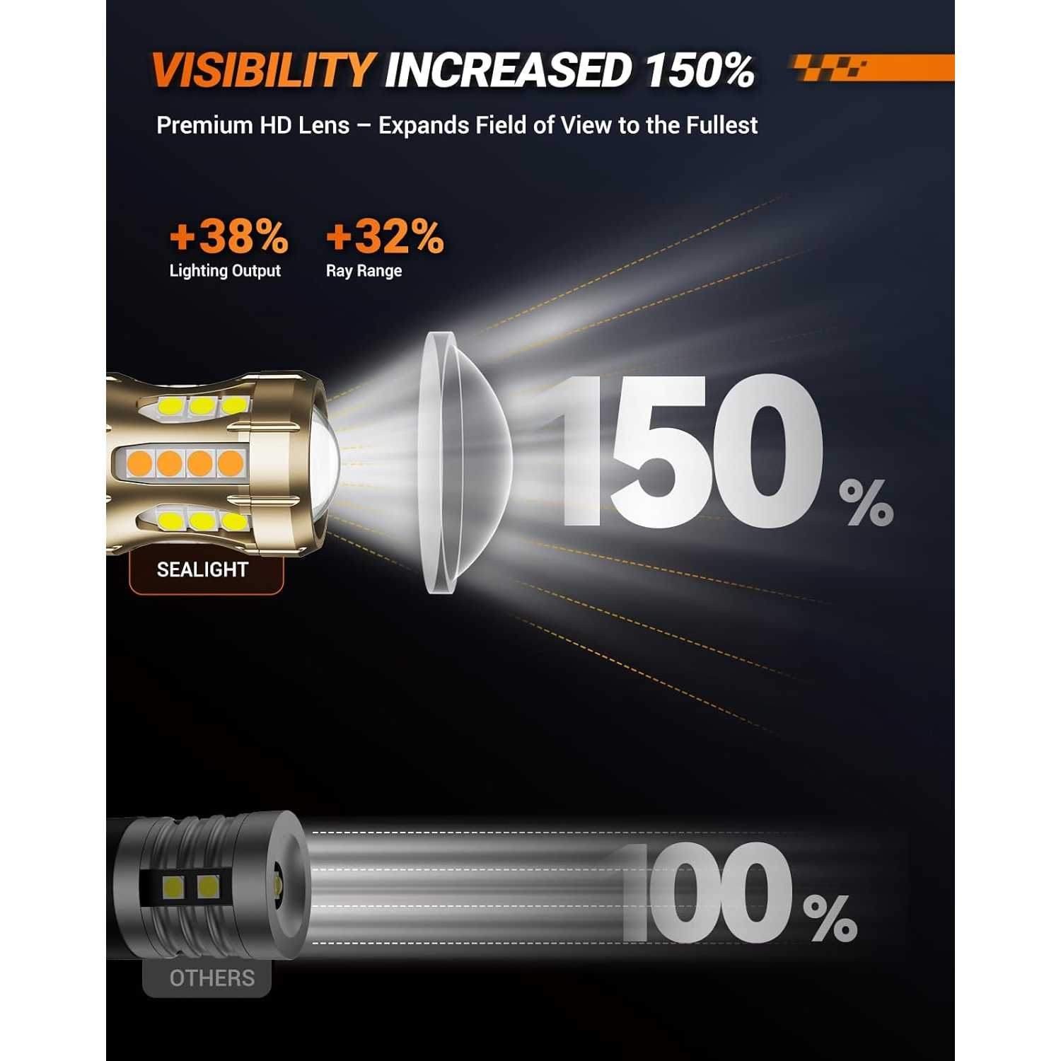 - (Super Bright)SEALIGHT 7443 LED Switchback are equipped with 34PCS High-Quality 3030 LED chips, providing 360° full illumination, suitable for daytime running lights (DRL) or parking lights.