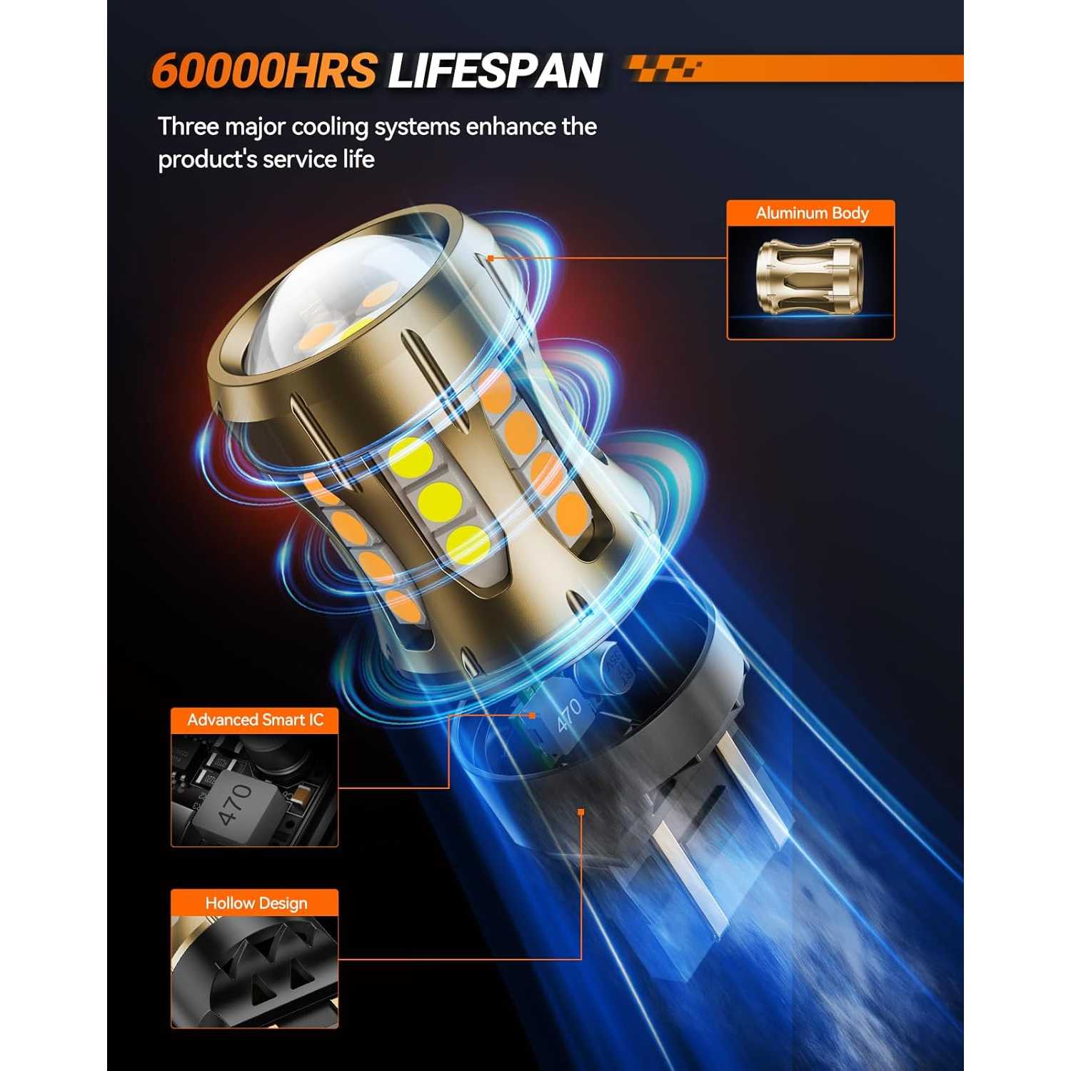 - (60,000-Hour Lifespan)Featuring a full aluminum body design that effectively draws heat away from critical lamp components. Our 7443 LED switchback turn signal bulbs deliver 60,000 hours of service life, significantly reducing the need for frequent replacements.